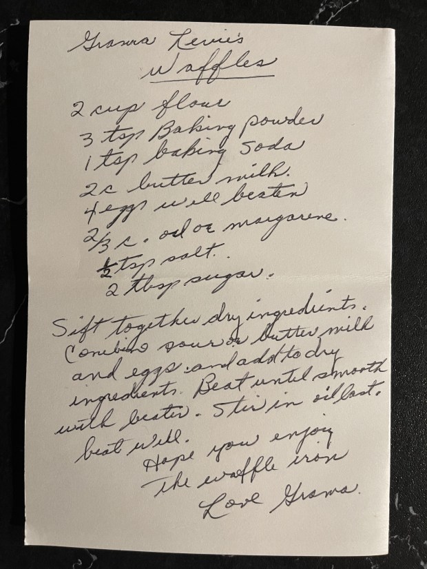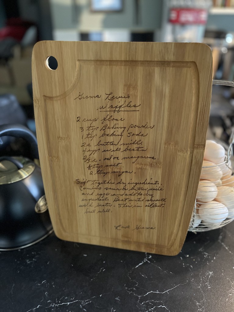 A hand written recipe in a Christmas card once thought to be lost from “grams” We are able to transpose in the original hand writing and transfer this to a custom board of your choosing.